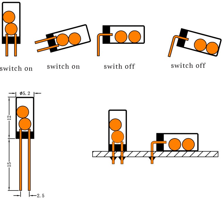 สวิตช์ความเอียง/สั่นแบบ PCB ทำงานเปิด/ปิด สัญญาณไฟฟ้า ตามภาพ
